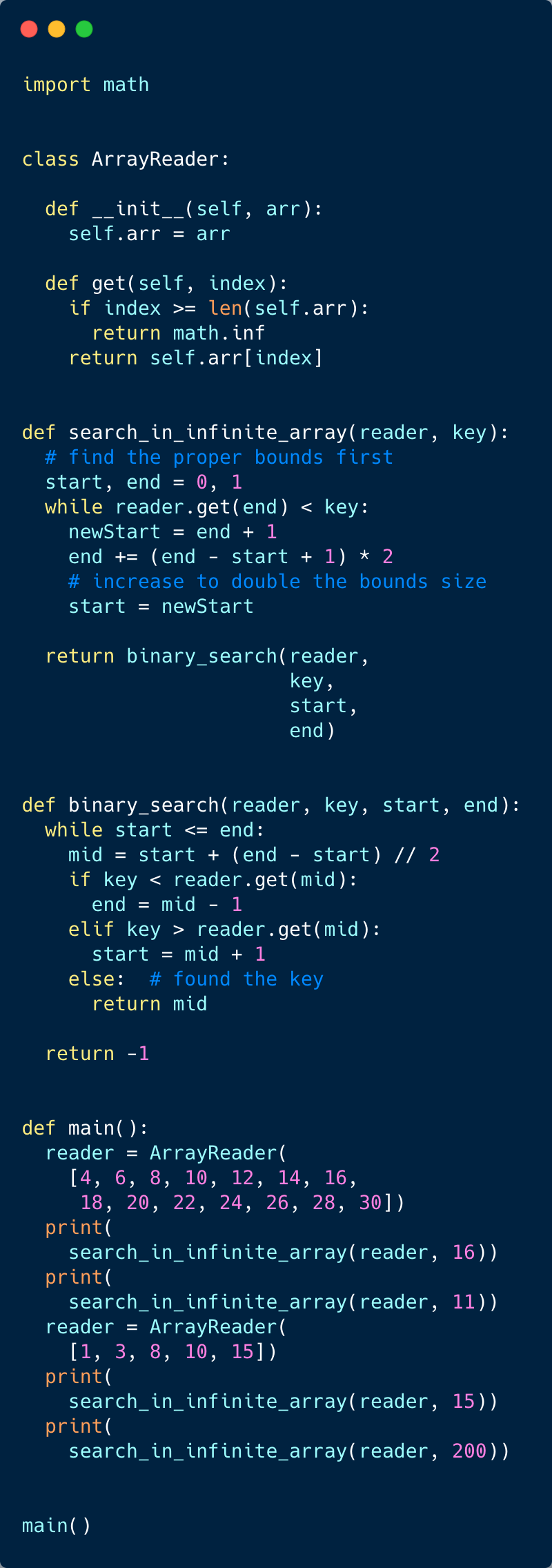 Since it is not possible to define an array with infinite (unknown) size, you will be provided with an interface ArrayReader to read elements of the array. ArrayReader.get(index) will return the number at index; if the array’s size is smaller than the index, it will return Integer.MAX_VALUE.