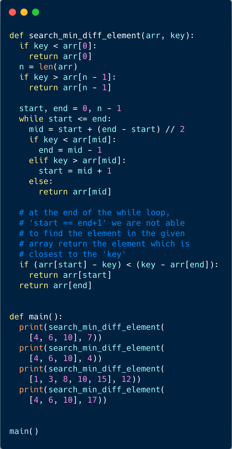 We can use a similar approach as discussed in Order-agnostic Binary Search. We will try to search for the ‘key’ in the given array. If we find the ‘key’ we will return it as the minimum difference number. If we can’t find the ‘key’, (at the end of the loop) we can find the differences between the ‘key’ and the numbers pointed out by indices start and end, as these two numbers will be closest to the ‘key’. The number that gives minimum difference will be our required number.