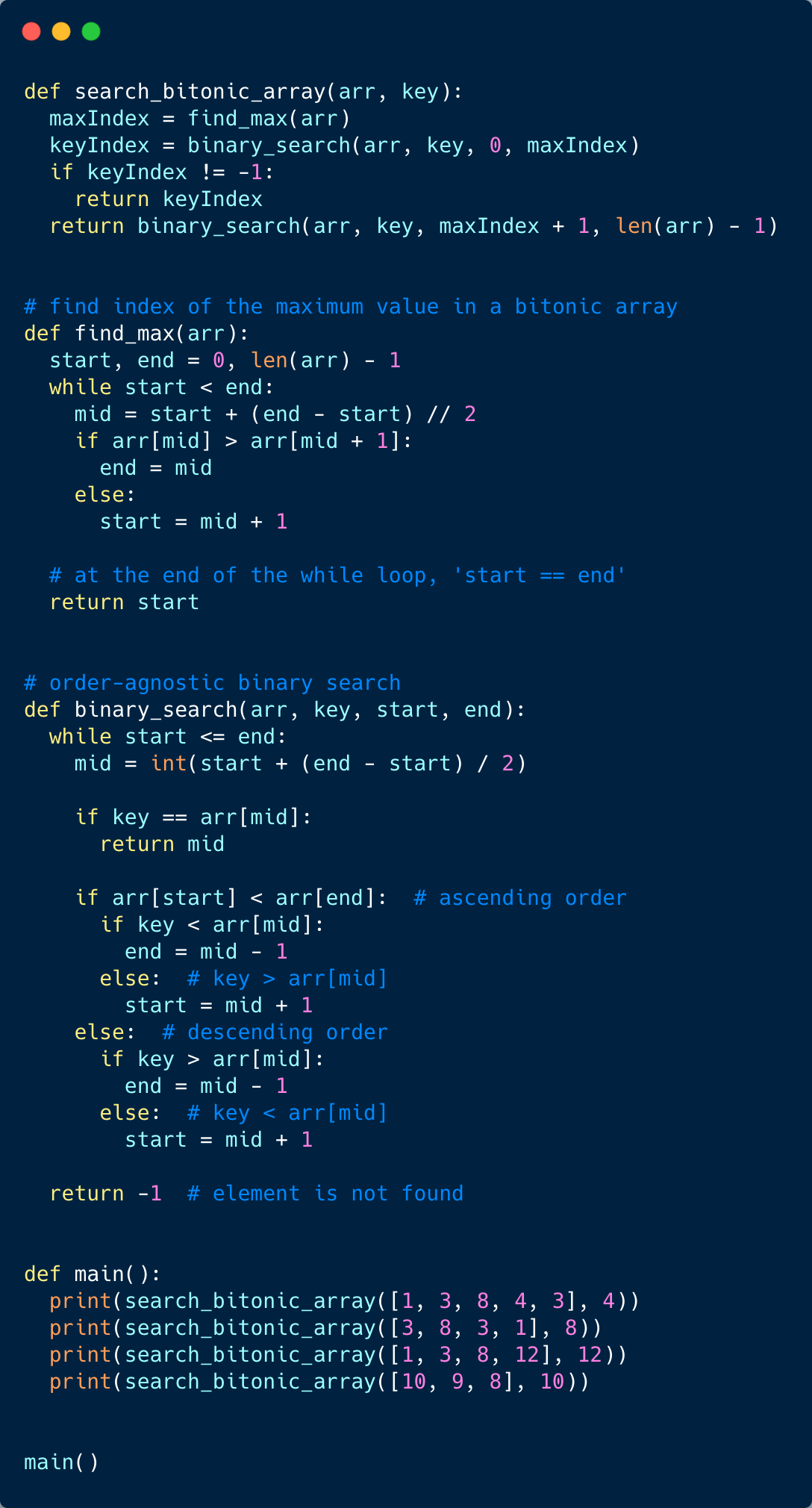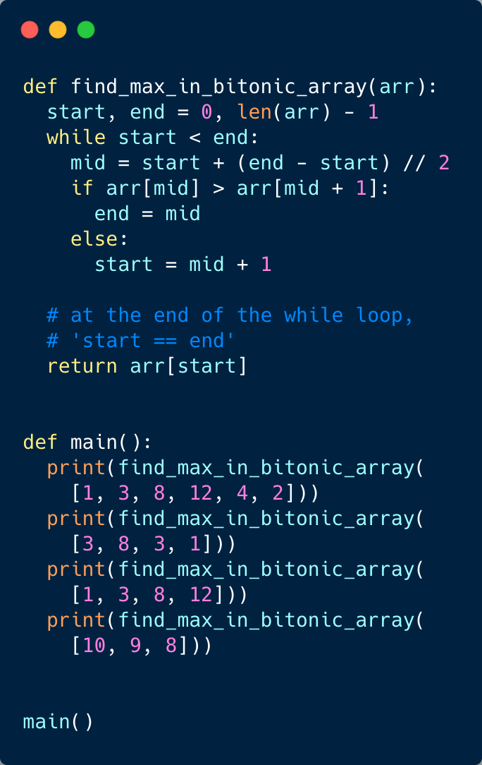 arr[middle] > arr[middle + 1], we are in the second (descending) part of the bitonic array. Therefore, our required number could either be pointed out by middle or will be before middle. This means we will be doing: end = middle.arr[middle] <= arr[middle + 1], we are in the first (ascending) part of the bitonic array. Therefore, the required number will be after middle. This means we will be doing: start = middle + 1.We can break when start == end. Due to the two points mentioned above, both start and end will be pointing at the maximum number of the bitonic array.