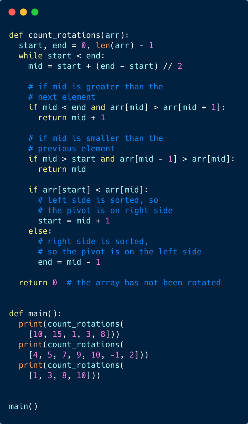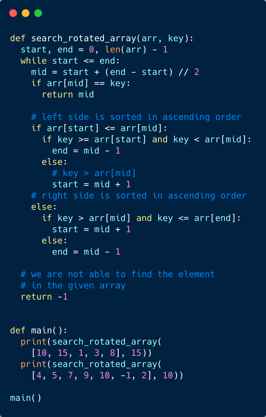 arr[start] < arr[middle], the numbers from start to middle are sorted.middle + 1 to end are sorted.Since we are reducing the search range by half at every step, this means that the time complexity of our algorithm will be O(logN) where ‘N’ is the total elements in the given array.
