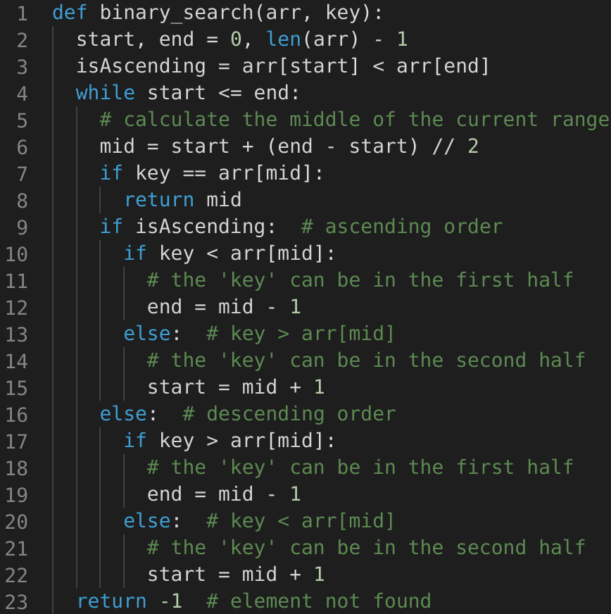 start and middle we can easily find out if the ‘key’ lies between indices start and middle; if it does, we can skip the second part => end = middle -1.start = middle + 1.Since we are reducing the search range by half at every step, this means that the time complexity of our algorithm will be O(logN) where ‘N’ is the total elements in the given array.