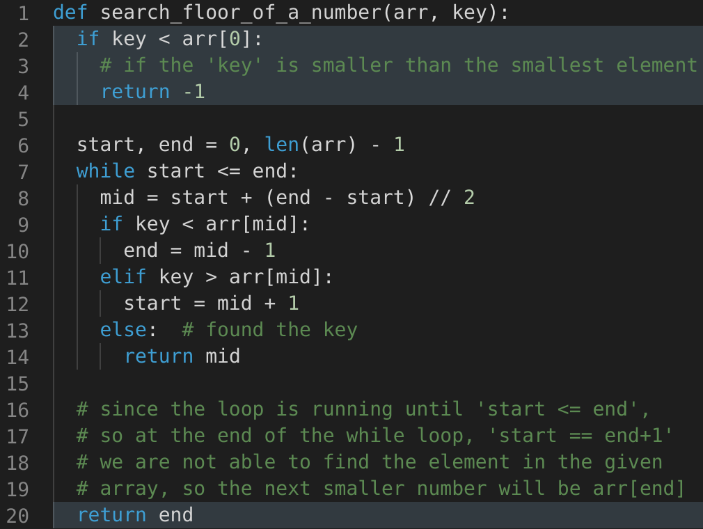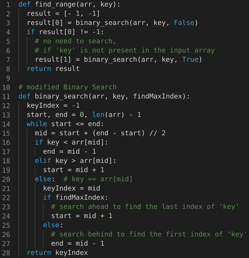end = middle - 1 to see if the key is present before middle.start = middle + 1 to see if the key is present after middle.In both cases, we will keep track of the last position where we found the ‘key’. These positions will be the required range.