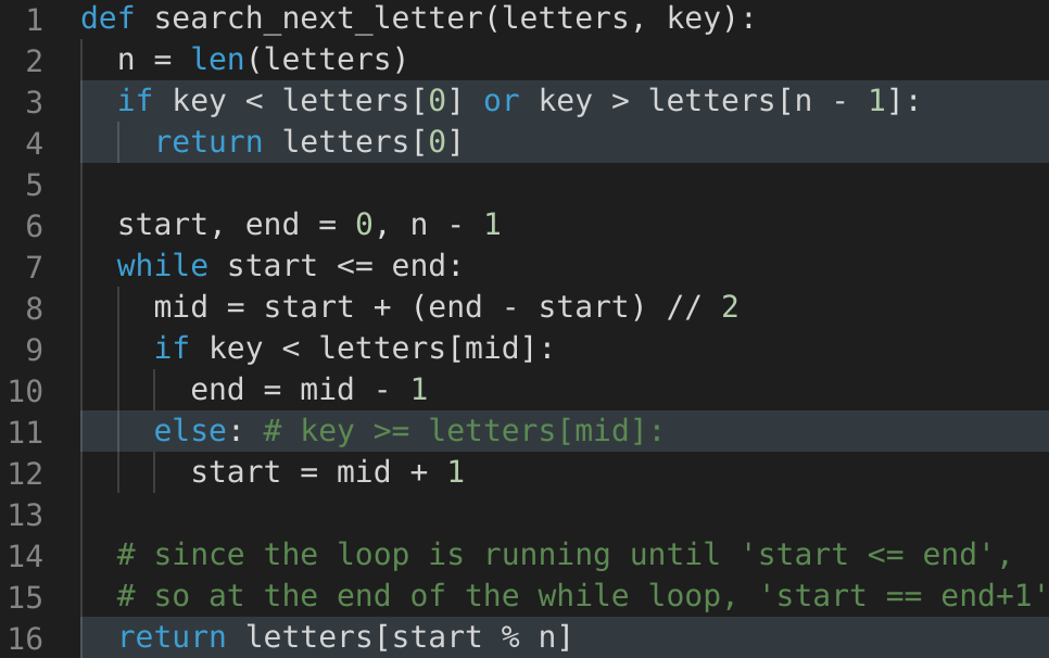 key == arr[middle]. To handle this case, we can update our start range to start = middle +1.In the end, instead of returning the element pointed out by start, we have to return the letter pointed out by start % array_length. This is needed because of point 2 discussed above. Imagine that the last letter of the array is equal to the ‘key’. In that case, we have to return the first letter of the input array.