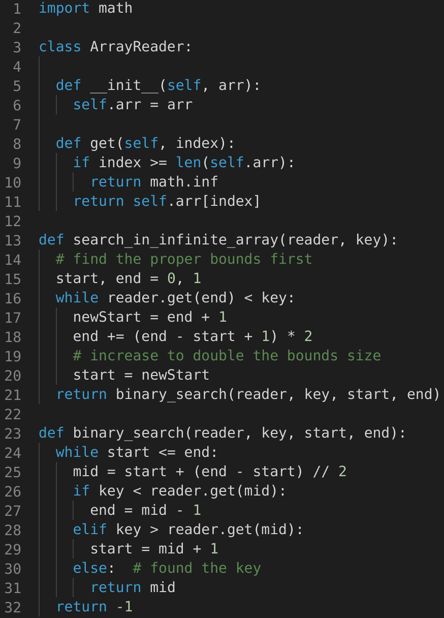 Since it is not possible to define an array with infinite (unknown) size, you will be provided with an interface ArrayReader to read elements of the array. ArrayReader.get(index) will return the number at index; if the array’s size is smaller than the index, it will return Integer.MAX_VALUE.