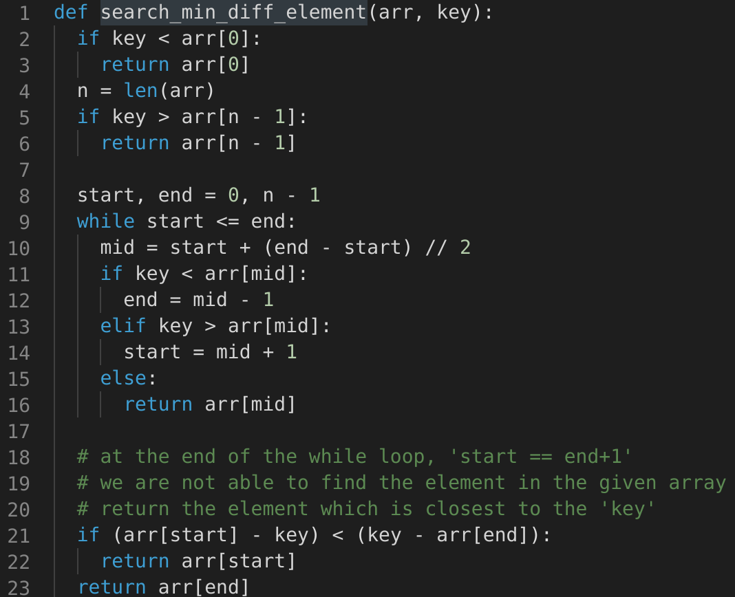 We can use a similar approach as discussed in Order-agnostic Binary Search. We will try to search for the ‘key’ in the given array. If we find the ‘key’ we will return it as the minimum difference number. If we can’t find the ‘key’, (at the end of the loop) we can find the differences between the ‘key’ and the numbers pointed out by indices start and end, as these two numbers will be closest to the ‘key’. The number that gives minimum difference will be our required number.