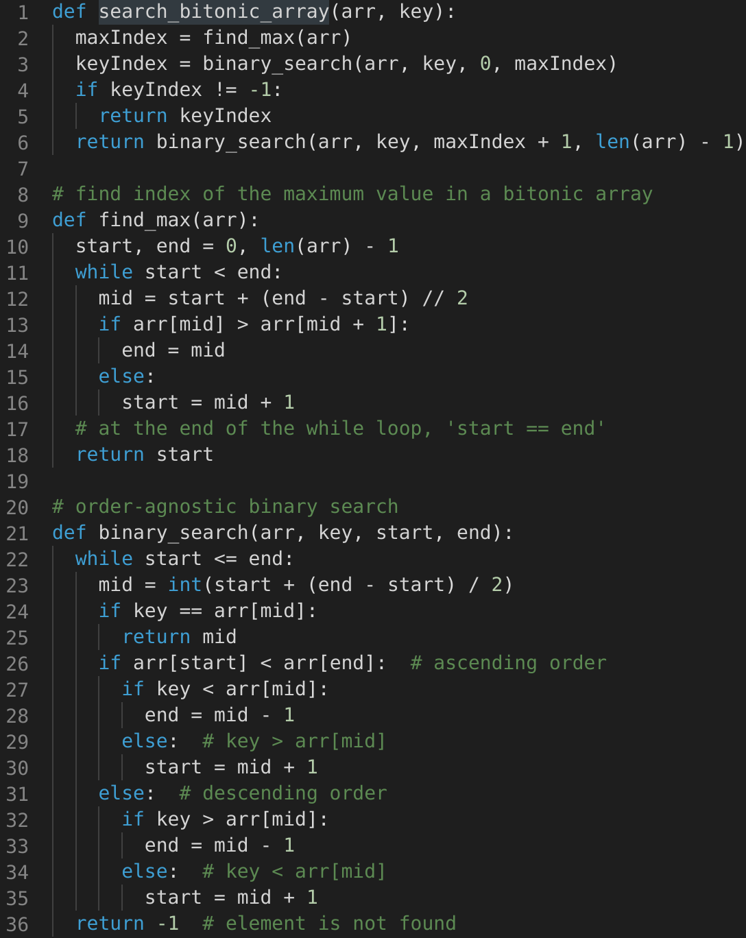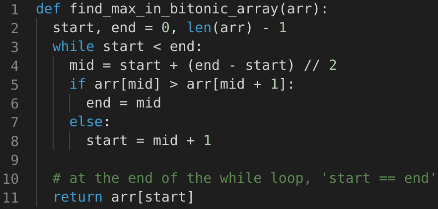 arr[middle] > arr[middle + 1], we are in the second (descending) part of the bitonic array. Therefore, our required number could either be pointed out by middle or will be before middle. This means we will be doing: end = middle.arr[middle] <= arr[middle + 1], we are in the first (ascending) part of the bitonic array. Therefore, the required number will be after middle. This means we will be doing: start = middle + 1.We can break when start == end. Due to the two points mentioned above, both start and end will be pointing at the maximum number of the bitonic array.