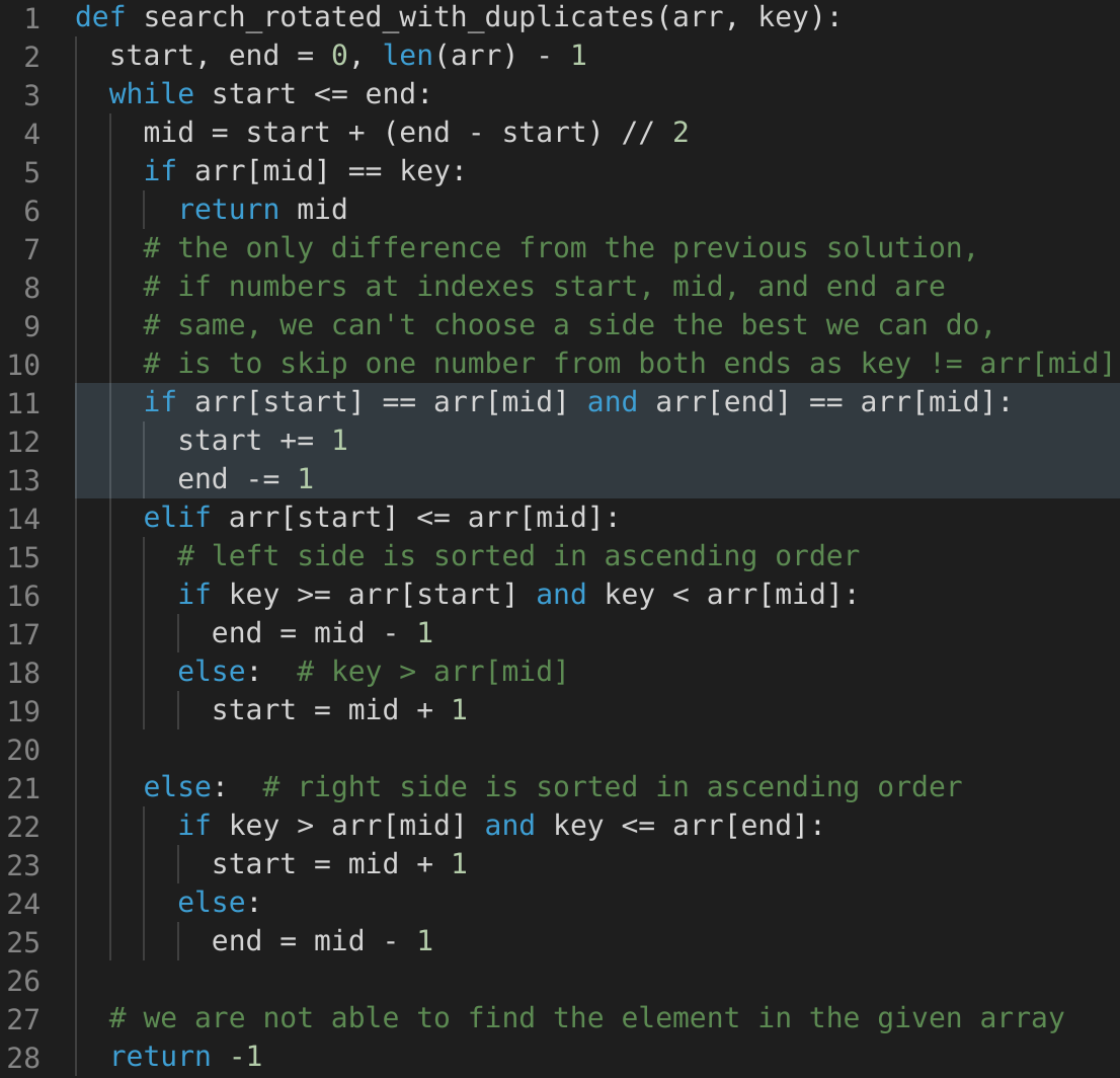 arr[start] <= arr[middle], the numbers from start to middle are sorted in ascending order.middle+1 to end are sorted in ascending order.Once we know which part of the array is sorted, it is easy to adjust our ranges. For example, if option-1 is true, we have two choices: