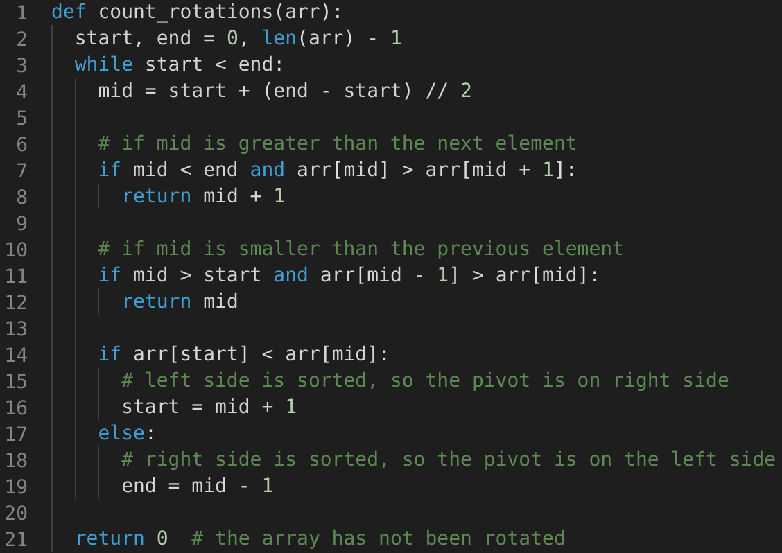 arr[start] < arr[middle], the numbers from start to middle are sorted.middle + 1 to end are sorted.Since we are reducing the search range by half at every step, this means that the time complexity of our algorithm will be O(logN) where ‘N’ is the total elements in the given array.