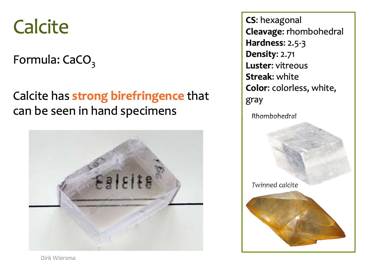 Kalsitt har kraftig birefringens som kan sees i håndprøver.
