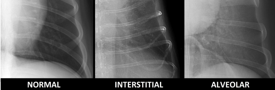 An alveolar pattern are cloudy to dense opacities and may be indicative of pulmonary edema, bronchopneumonia, hemorrhage, an atelectasis.