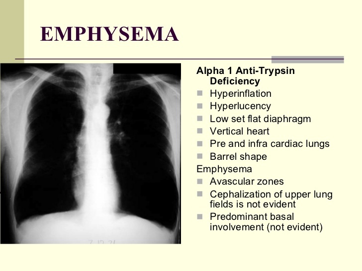 Pulmonary parenchyma tends to be more lucent than normal reflecting the loss of tissue and hyperinflation. Often the cardiac silhouette appears narrow, the diaphragmatic domes are flattened, and the lung volumes appear larger.