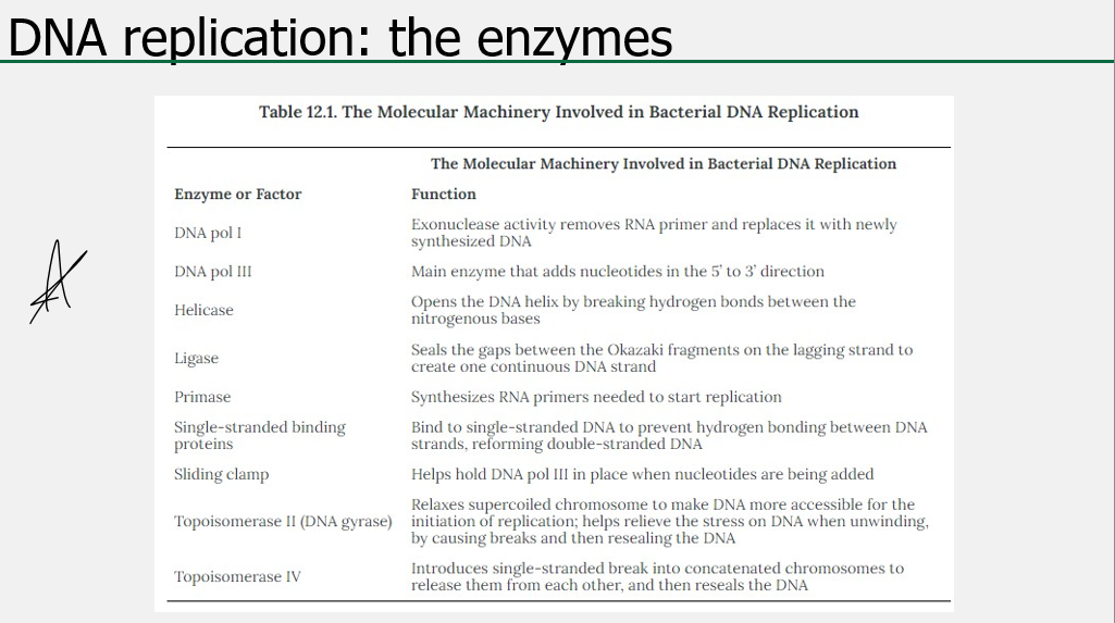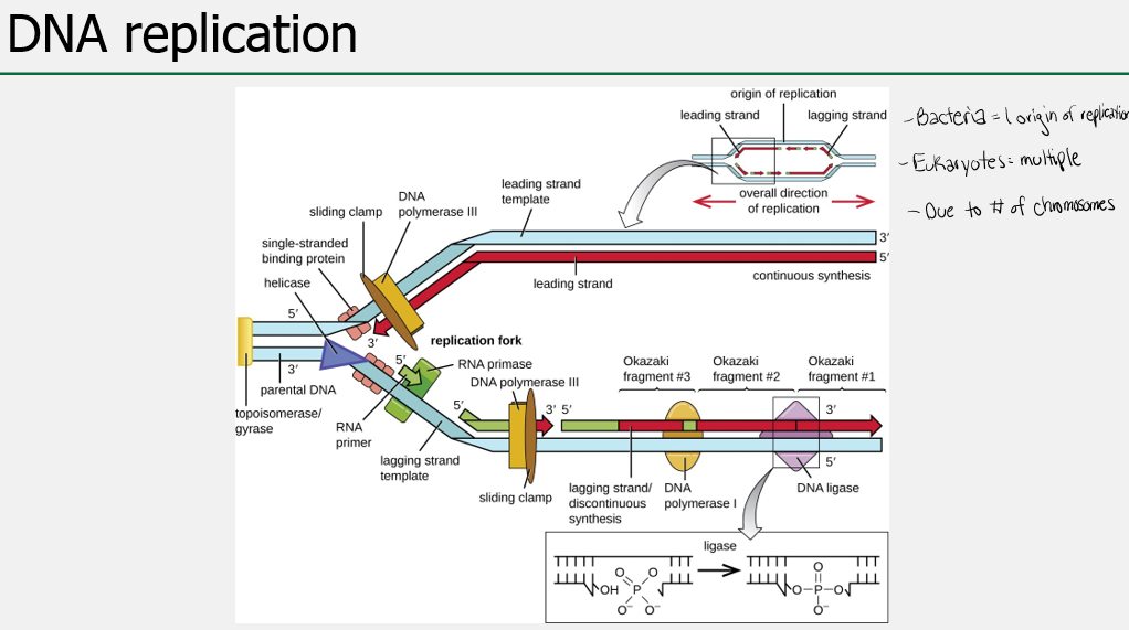 -Helicase separates the DNA strands (breaks H bonds between nitrogenous base pairs)