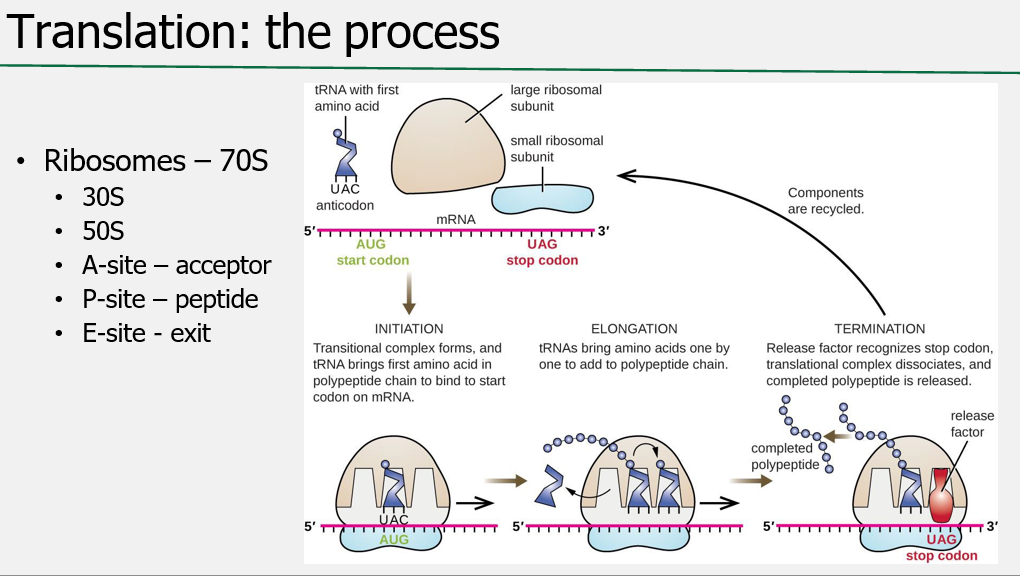 -Synthesizes protein in 5’-3’ (same as transcription) and can occur simultaneously only in prokaryotes (polyribosomes inside the cytoplasm)