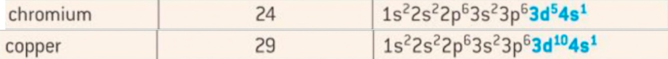 A half filled d5 subshell (chromium) and a fully filled d10 subshell (copper) give additional stability
