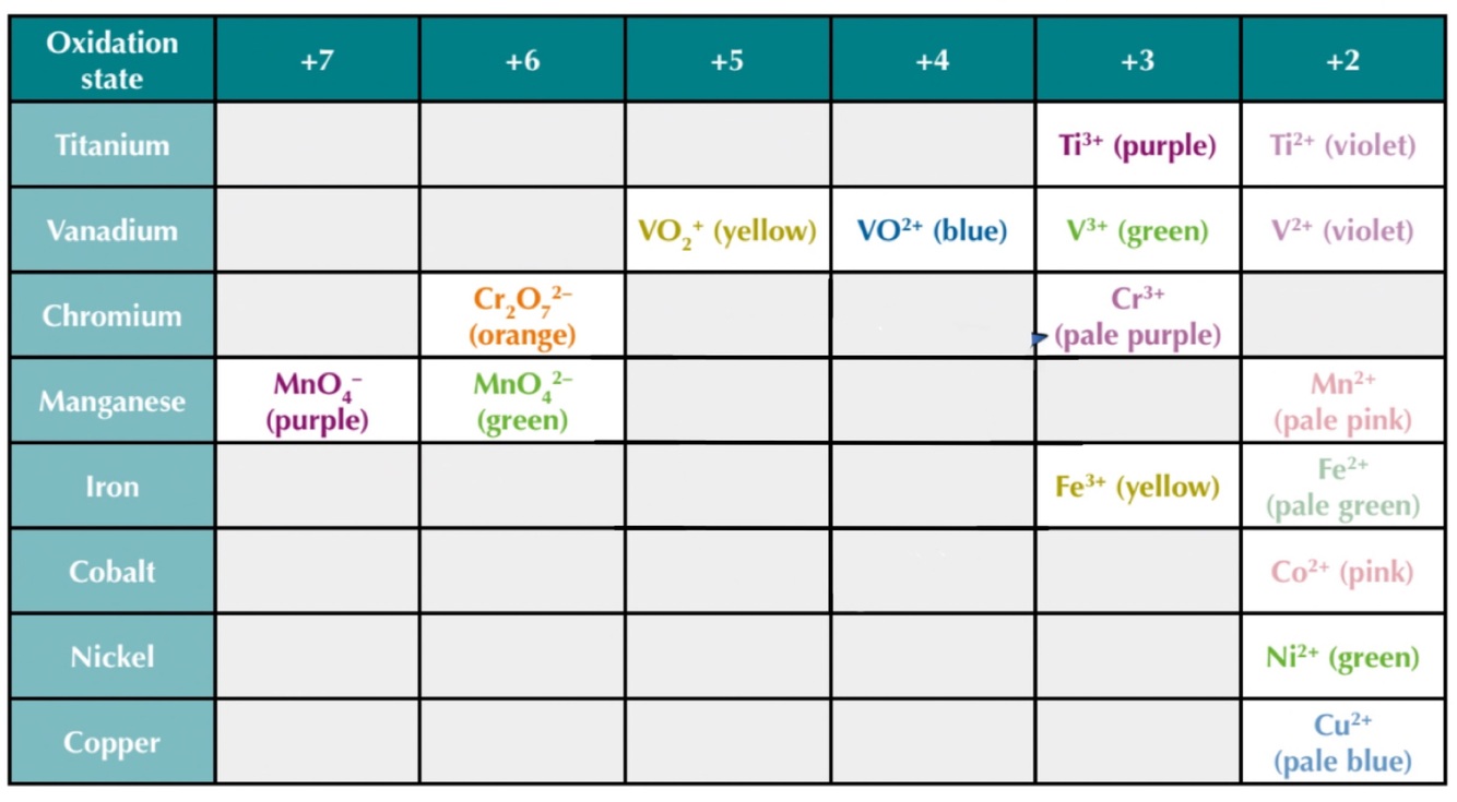 Draw out table of transition metals in 4th period and all their colours for oxidation numbers ranging from +7 to +2
