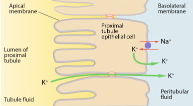 Additionally, potassium (K+) moves across the basolateral membrane into tubule epithelial cells by the Na+/K+-ATPase primary active transport protein and out of tubule epithelial cells through basolateral potassium channels.