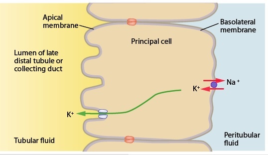 Potassium moves across the basolateral membrane into principal cells of the distal tubule by the Na+/K+-ATPase primary active transport protein and moves across the apical membrane through potassium channels.