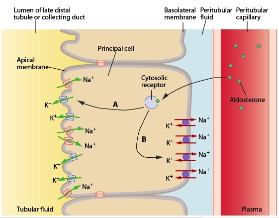 The hormone aldosterone binds to cytosolic receptors in the principal cells of the distal tubule or collecting ducts to increase insertion of additional potassium channels in the apical membrane (A) and additional Na+/K+-ATPases in the basolateral membrane (B).