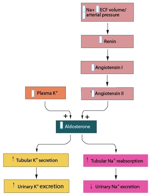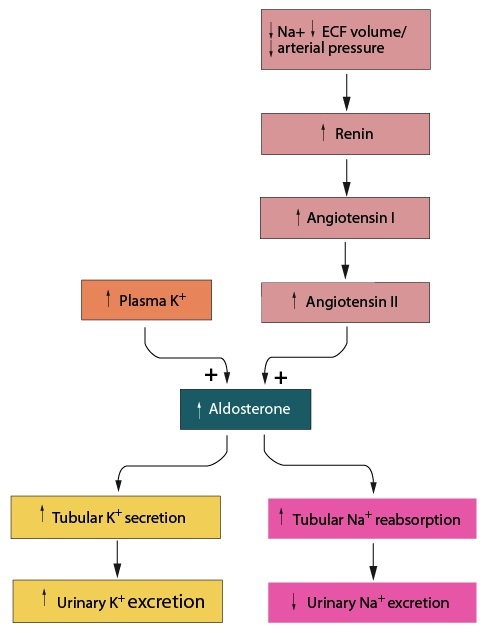 Aldosterone secretion is stimulated by changes to both the plasma concentrations of potassium (K+) and sodium (Na+).