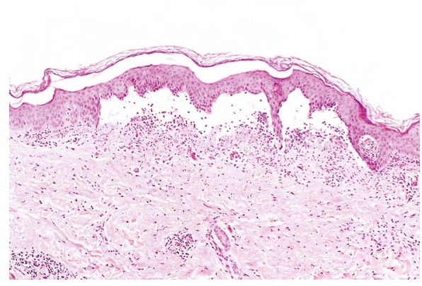 Durante o estágio agudo, há um infiltrado polimorfonuclear, com aumento no calibre de vasos circundantes. Com a cronicidade, há a cicatrização das margens e da borda e o infiltrado adquire um aspecto de linfócitos, macrófagos e plasmócitos