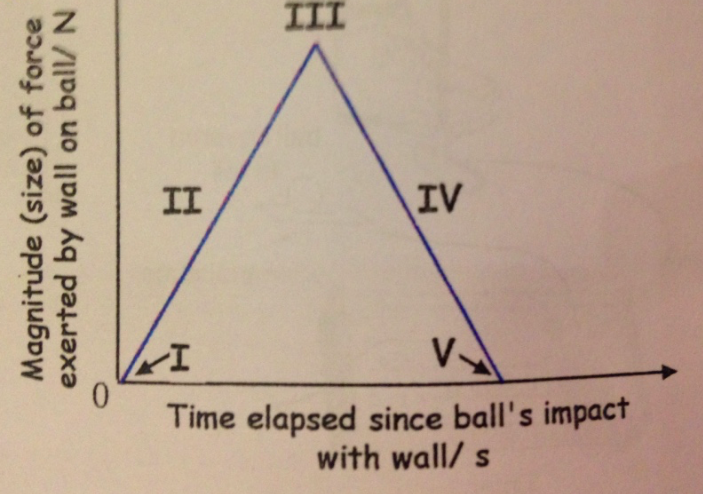force wall exerts on ball is 0 before impact rises to maximum as ball strikes wall and is deformed decreases to 0 as ball rebounds, regaining shape