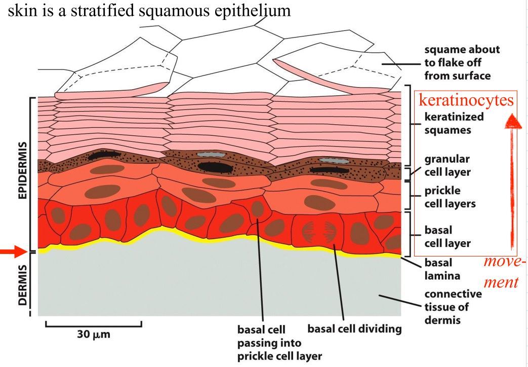 as cells begin to die they detach from the basal lamina, move up through the different layers until it reaches the surface and flakes off