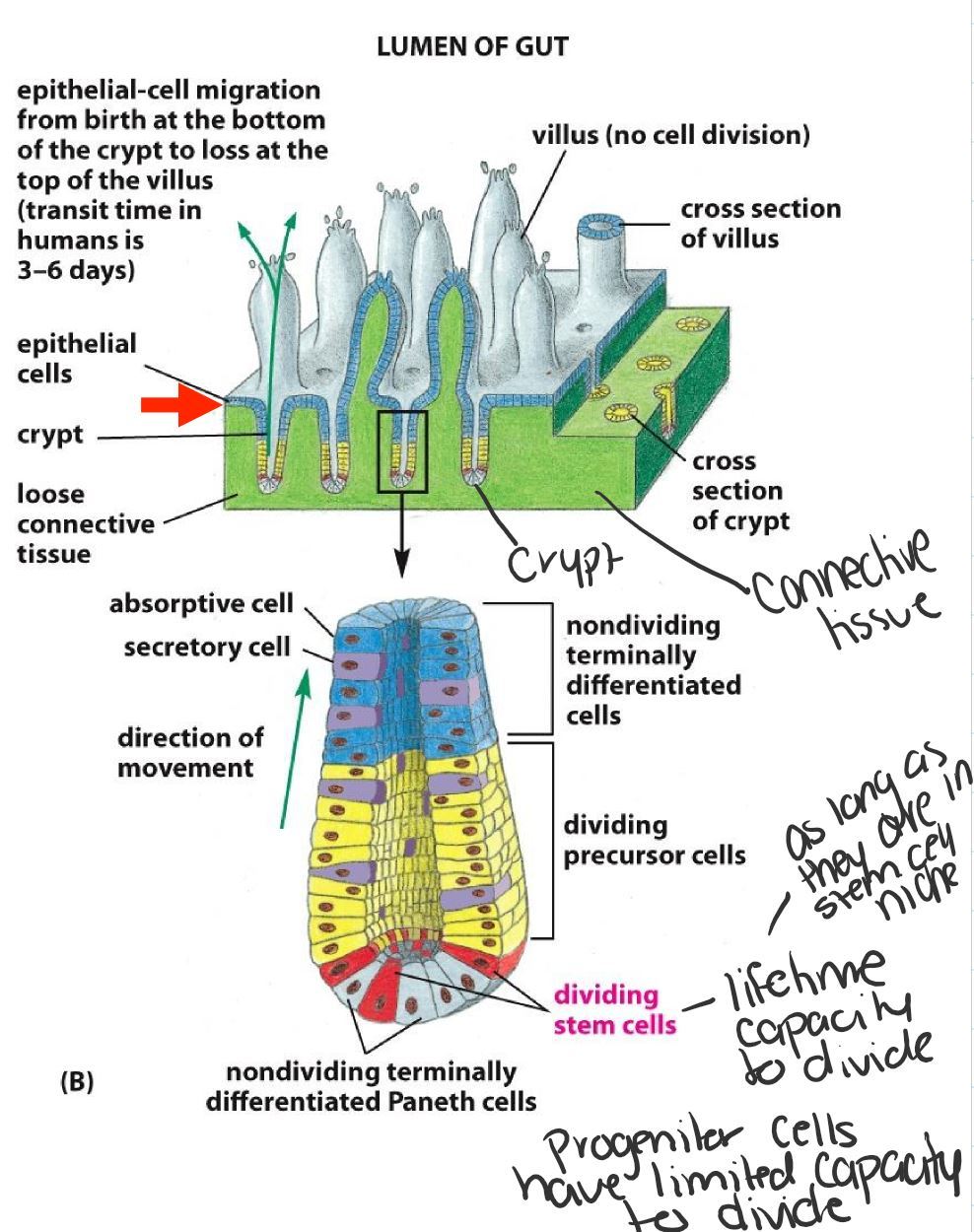 once they reach the top of the crypt, they become nondividing terminally differentiated cells