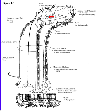 In motor neuron diseases the motor neurons, their motor axons, and secondarily the muscle fibers they innervated are affected (the motor unit).