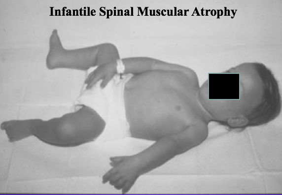 Here is a baby with the most severe motor neuron disease manifesting at birth with weakness , hypotonia, (floppy baby), areflexia, muscle atrophy, difficulty breathing and swallowing. They usually die early of respiratory failure.