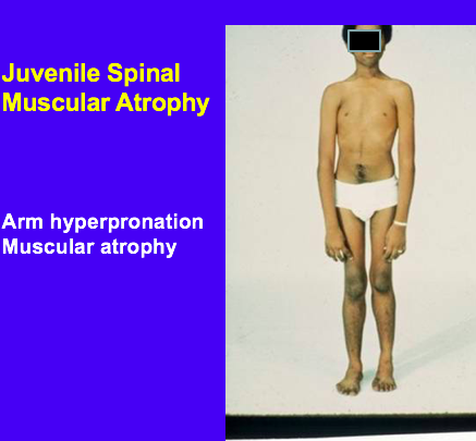 this is a patient with juvenile spinal muscular atrophy. This disease manifests in childhood and clinically resembles a muscular dystrophy.