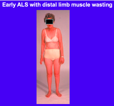 This woman with ALS shows early atrophy and weakness of the distal muscles.