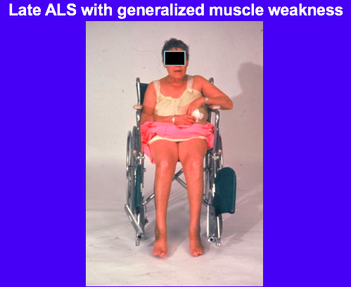 This woman has a more advanced case of ALS with difficulty closing her mouth. She is wheelchair bound and has hyperreflexia, bilateral Babinski signs, fasciculations, atrophy, and normal sensation.