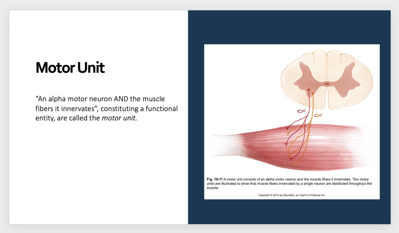 Motor Unit: An alpha motor neuron AND the muscle fibers it innervates.