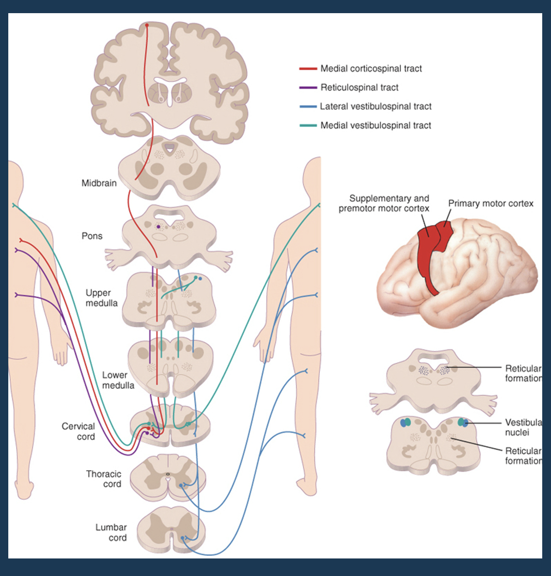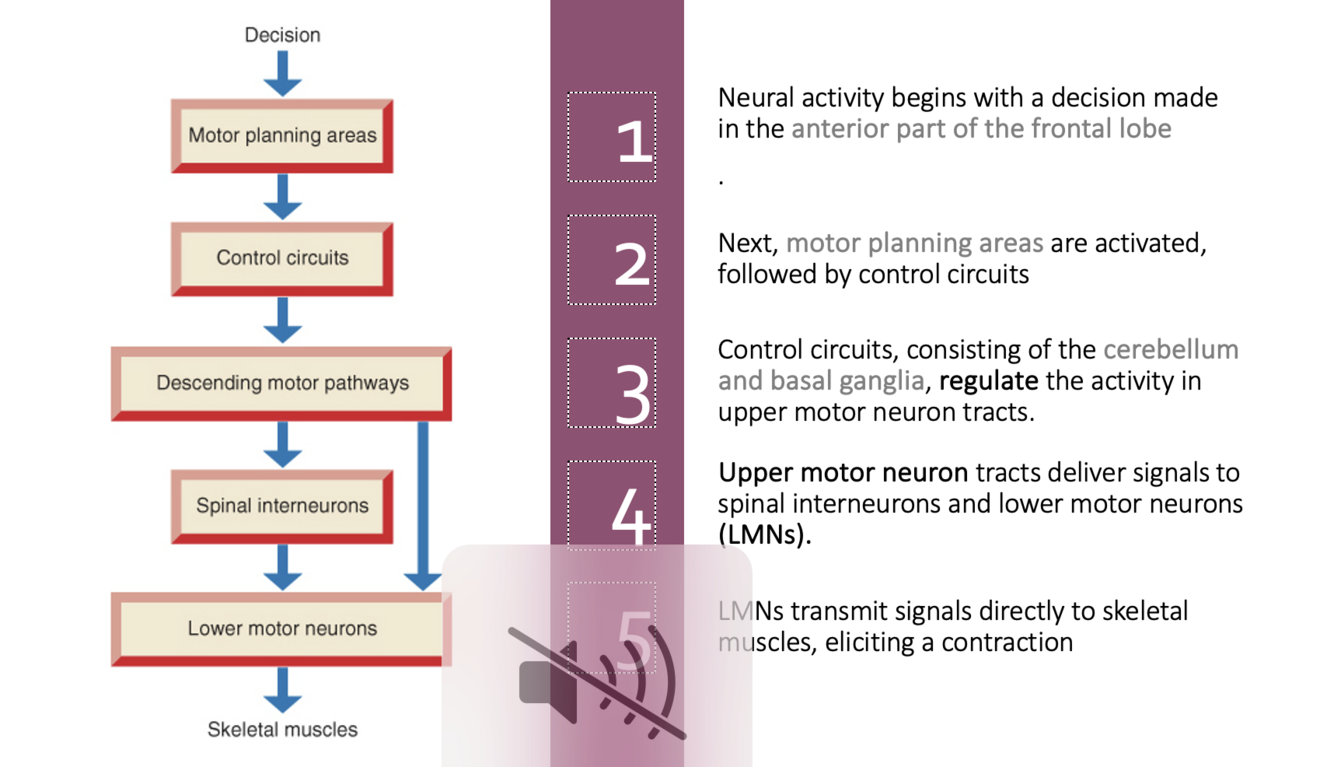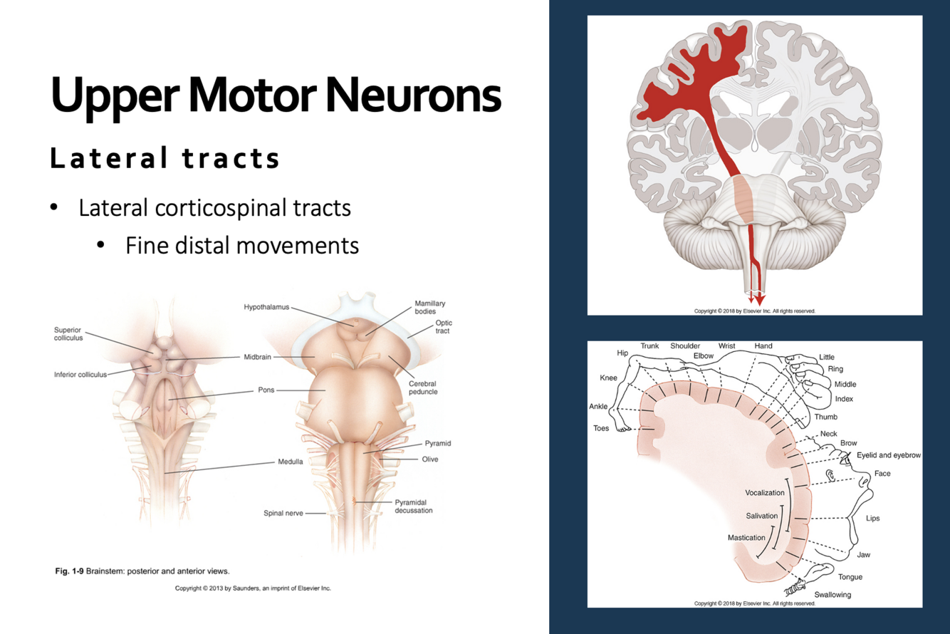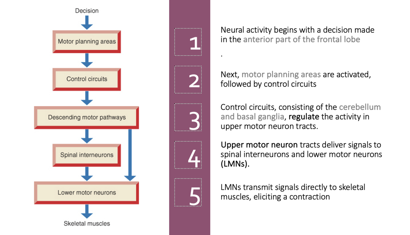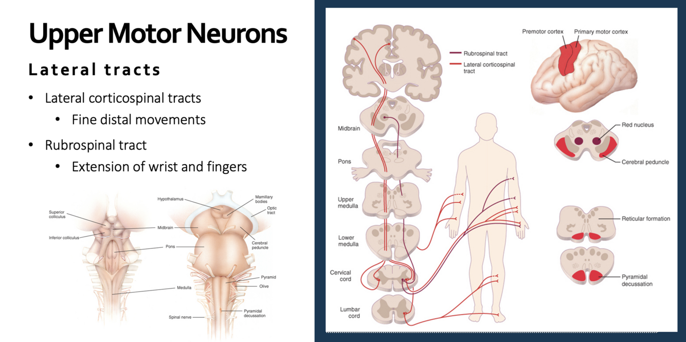 (4) Upper motor neuron tracts deliver signals to spinal interneurons and lower motor neurons (LMNs).