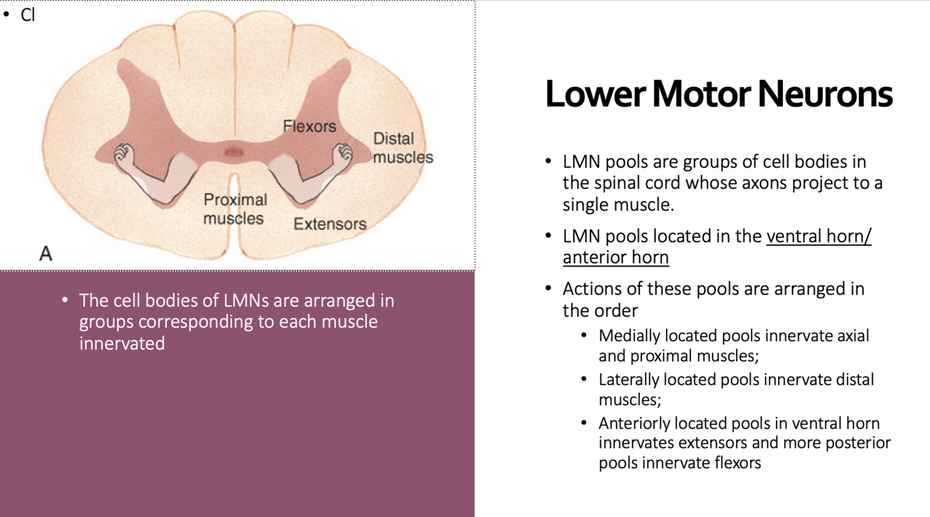 - LMN pools are groups of cell bodies in the spinal cord whose axons project to a single muscle.