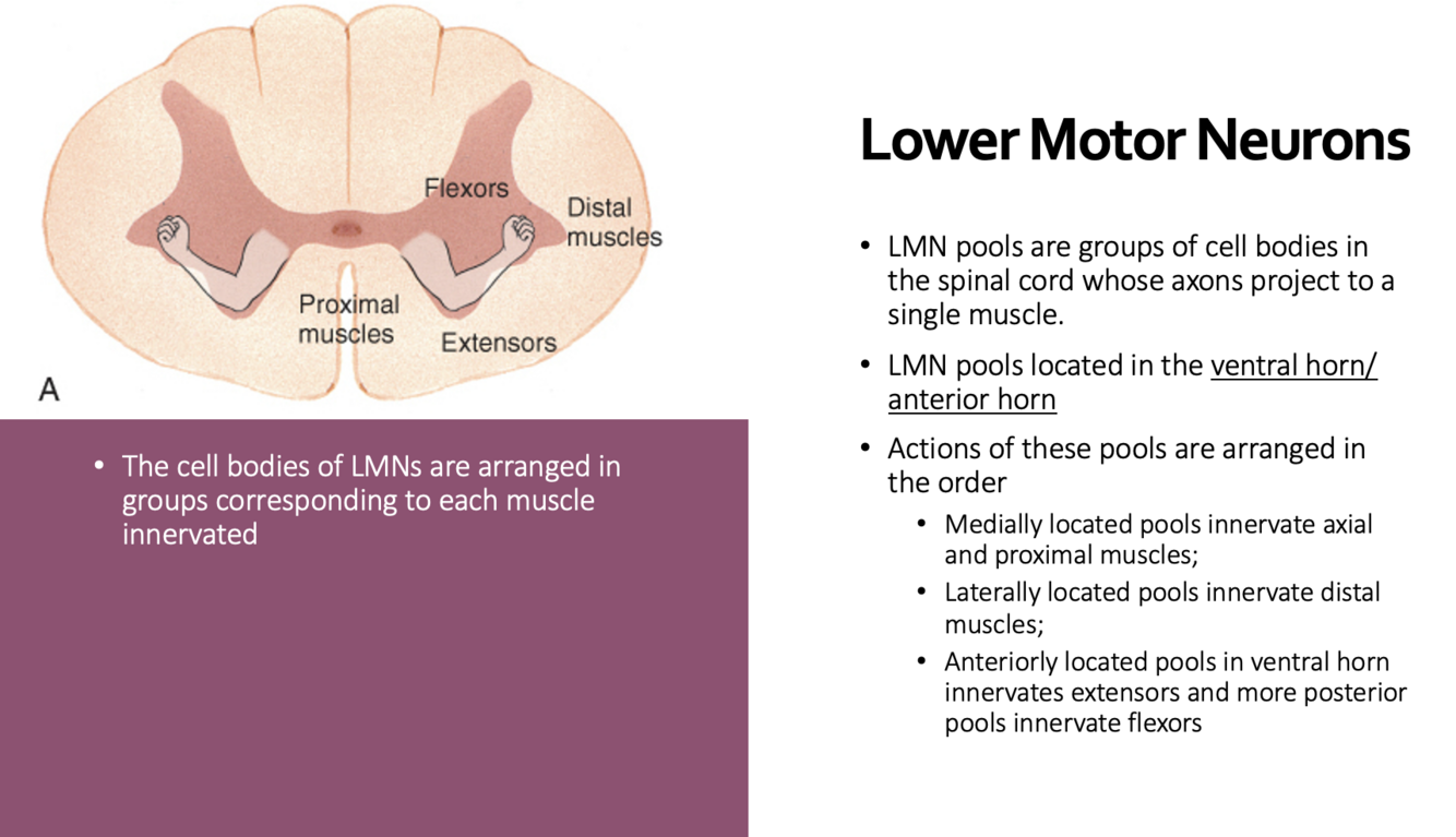 (LMN) Anteriorly located pools in ventral horn innervate = Extensors