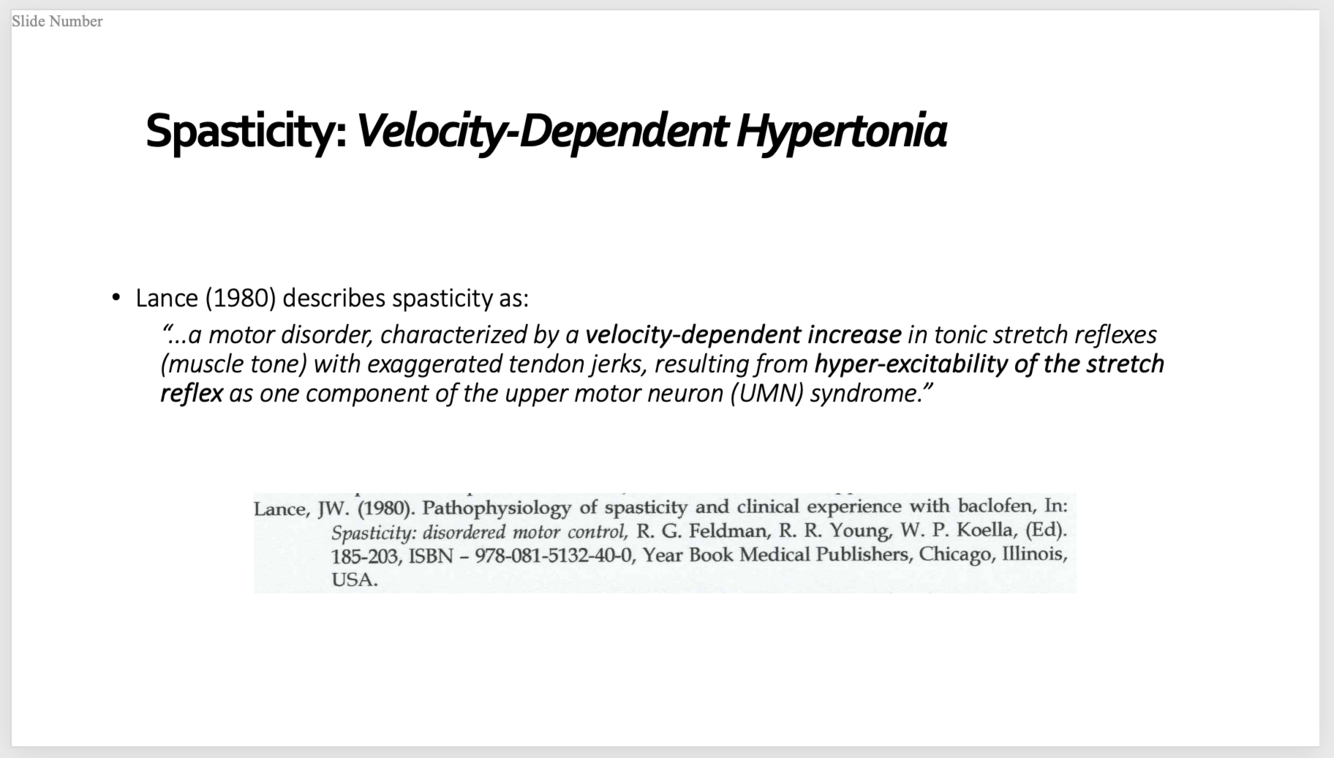 “A motor disorder, characterized by a velocity-dependent increase in tonic stretch reflexes (muscle tone) with exaggerated tendon jerks, resulting from hyper-excitability of the stretch reflex as one component of the upper motor neuron (UMN) syndrome” = ?