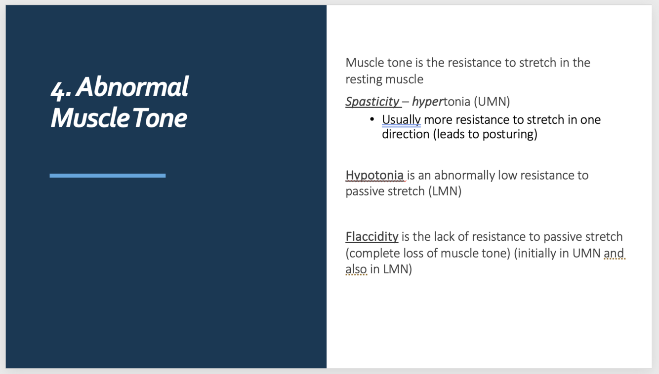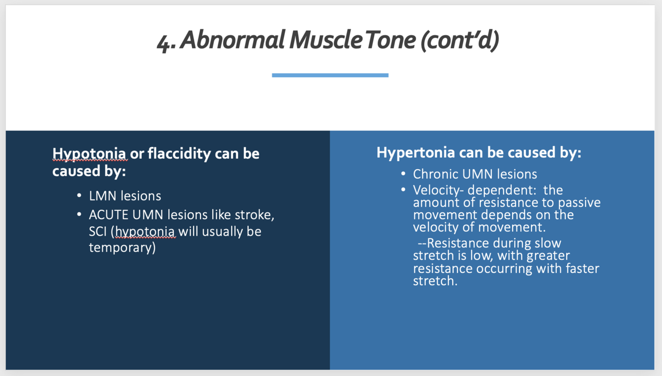 - Hypotonia is an abnormally low resistance to passive stretch (LMN).
