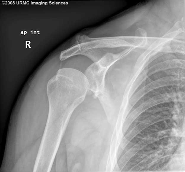 AP internal rotation view of the shoulder shows a low-lying humerus suspicious for joint laxity and instability or pseudo-subluxation. Cortical depression of the posterolateral humerus is consistent with a Hill-Sachs deformity. Deformity of the inferior glenoid with a bony fragment is also present and suggests a glenoid fracture (bony Bankart injury).
