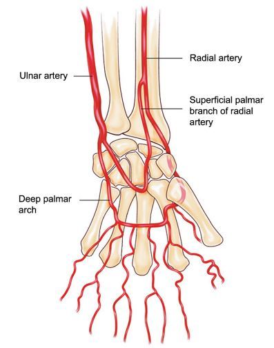 Deep branch of the radial artery travels through
