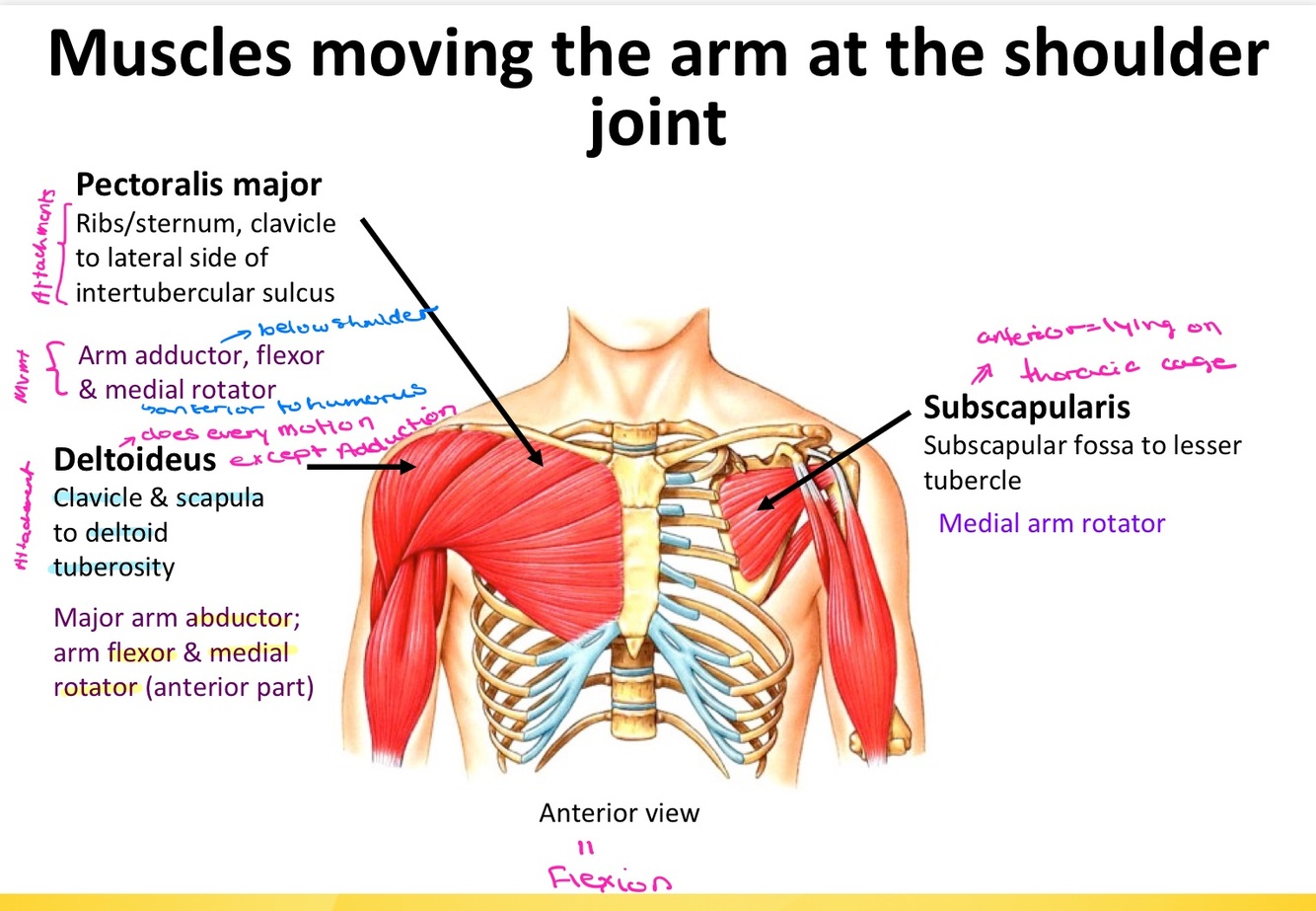 The Pectoralis major and deltoideus are both arm arm flexors and medial rotators