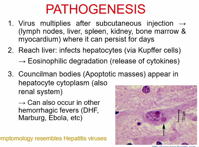 the Yellow fever virus infects hepatocytes and leads to eosinophilic degradation and release of cytokines