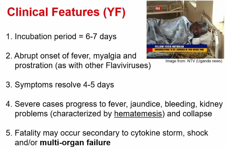 severe cases of YF progress to fever, jaundice, bleeding, kidney problems (characterized by hematemesis) and collapse