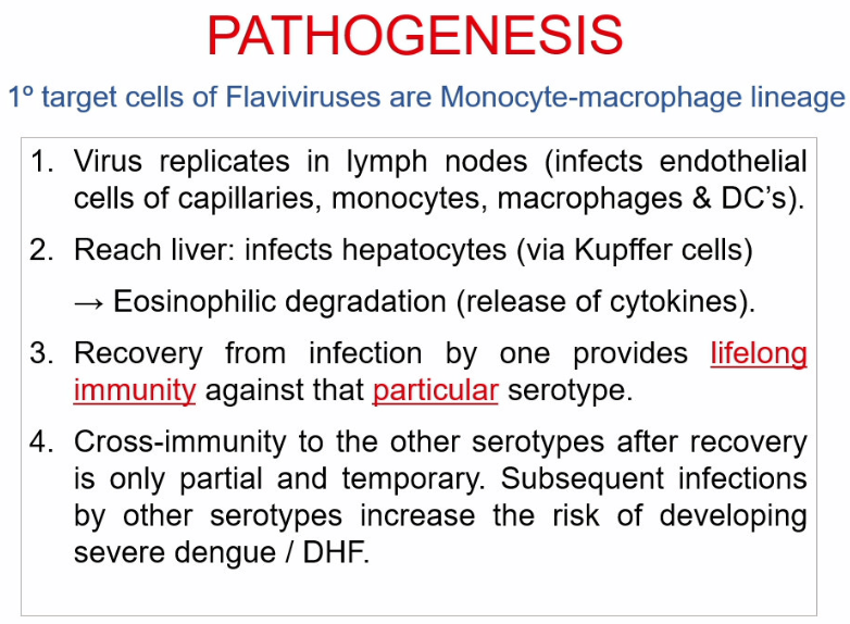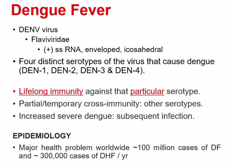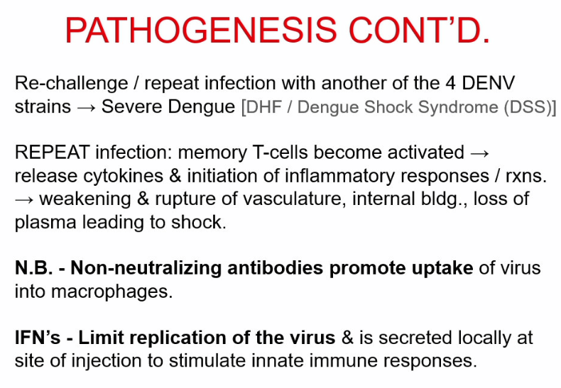 repeat infection with another of the 4 DENV strains can lead to severe Dengue (Dengue Hemorrhagic Fever (DHF) or Dengue shock syndrome (DSS))