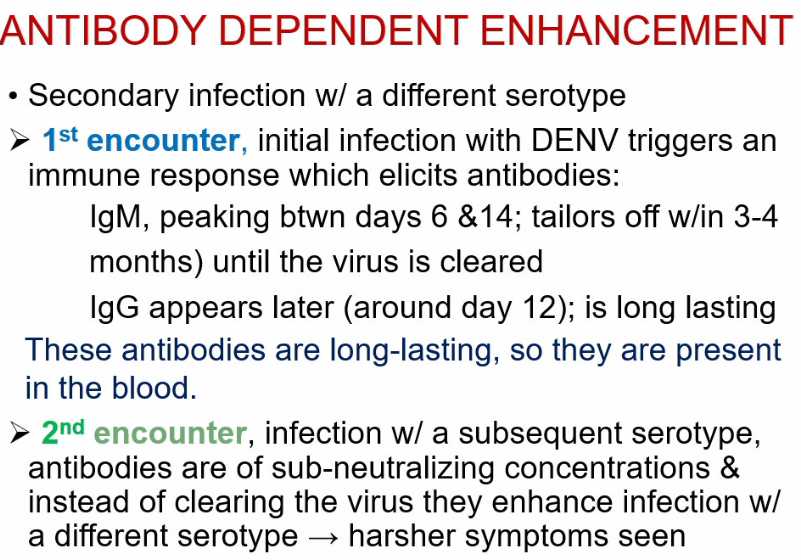 in a repeat infection with a subsequent serotype, antibodies are of sub-neutralizing concentrations and instead of clearing the virus, they enhance infection with a different serotype → harsher symptoms are seen