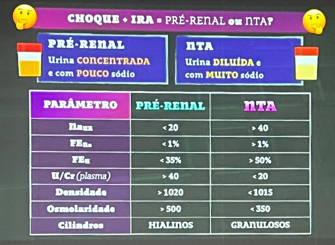 PRÉ-RENAL: urina concentrada, pouco sódio (Naur< 20, FEna< 1%, FEu < 35%, U/Cr > 40)
