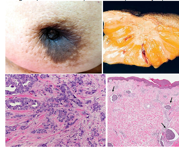 canaux lymphatiques pleins de cellules tumorales. Ont de la misère à se drainer (donne l’apparence d’orange)
