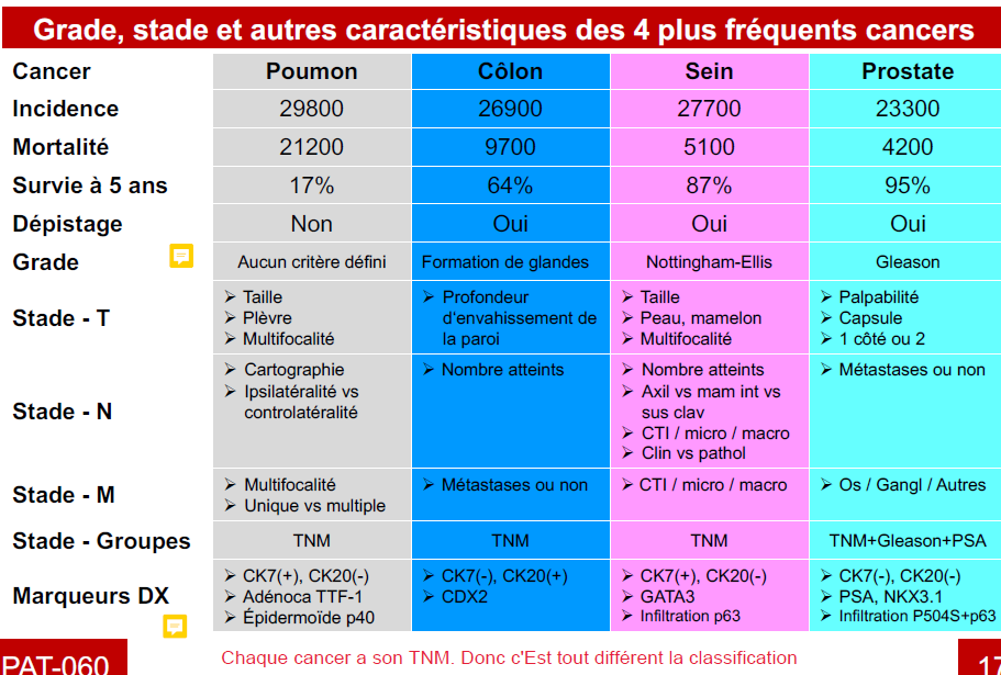 Décrire comment on détermine les stades et les grades des 4 cancers les plus fréquents (pas nécessaire de savoir par coeur, juste idée générale que c’est différent d’un à l’autre)