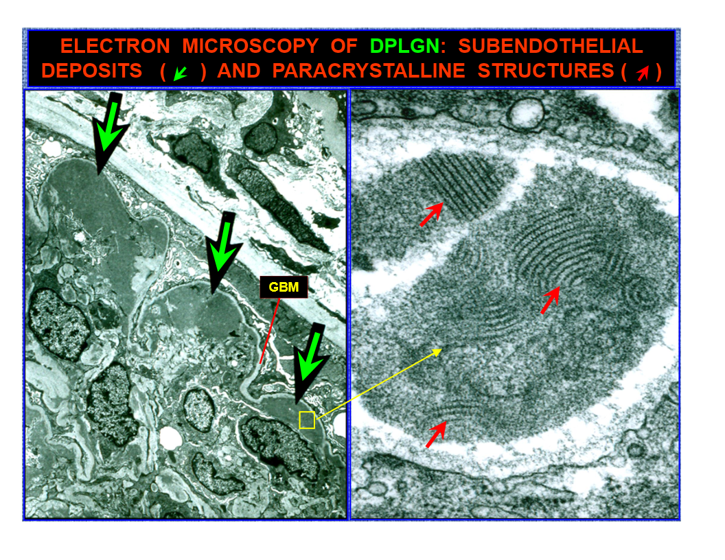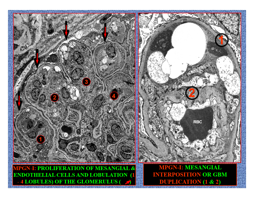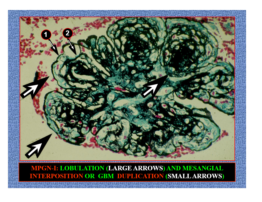 hypercellular glomeruli with accentuated lobules and mesangial interposition