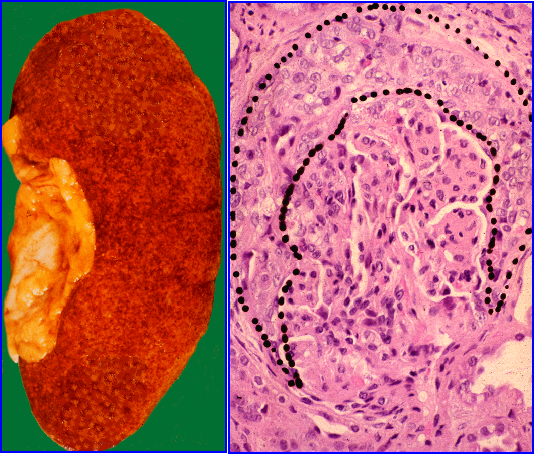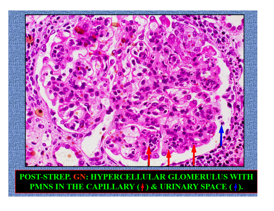 hypercellular glomeruilus with PMNs in the capillary and urinary space